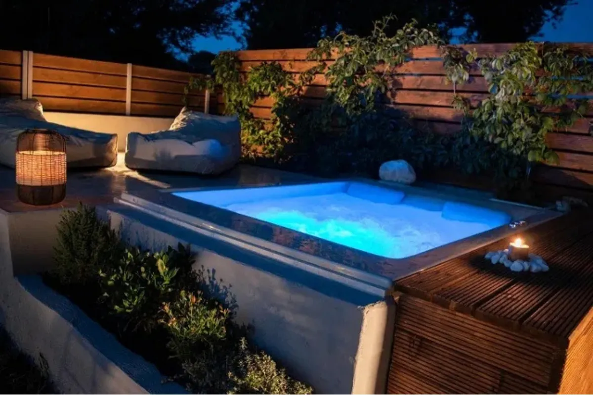 Τζακούζι εξωτερικού χώρου, ιδανικό για στιγμές χαλάρωσης, με υδρομασάζ που μετατρέπει κάθε βραδιά σε εμπειρία ευεξίας.