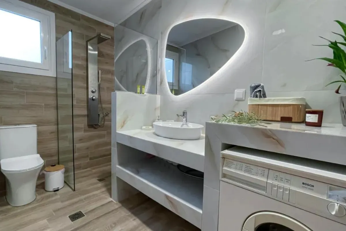 Μοντέρνο και φωτεινό μπάνιο εξοπλισμένο με πλυντήριο για άνετη και καθημερινή χρήση.